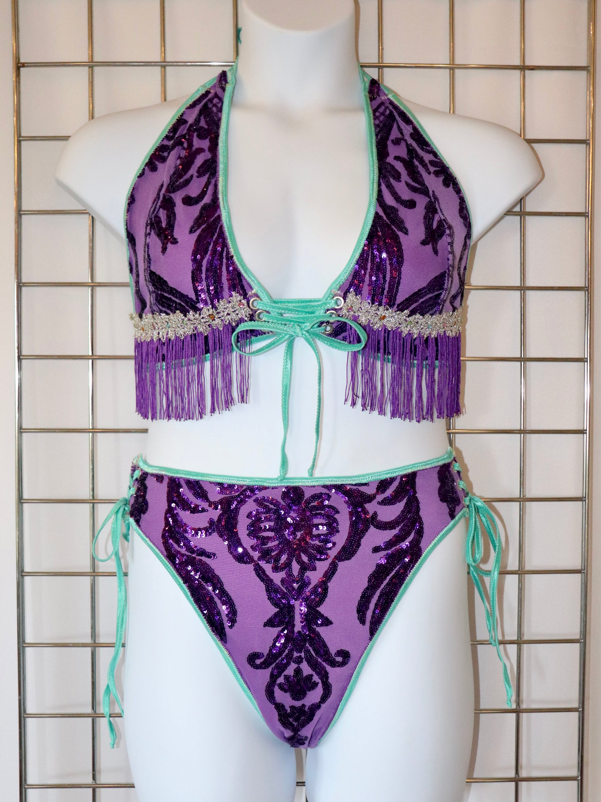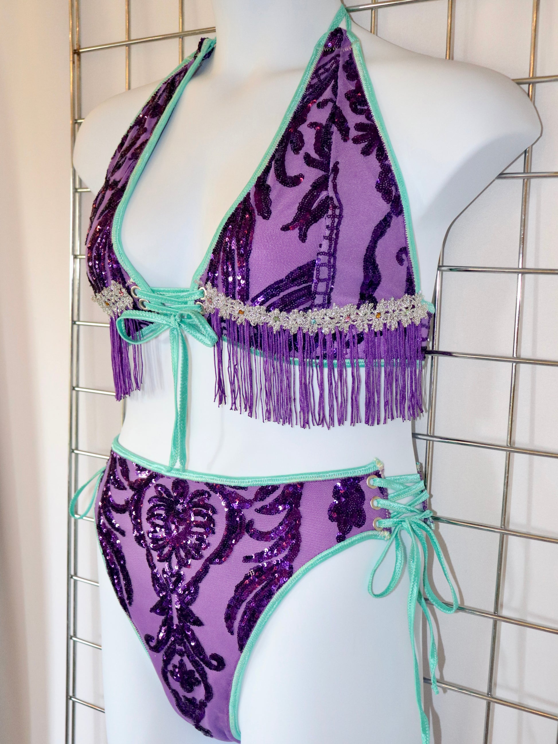 Top: A plunging halter bikini in a deep purple sequin fabric with baroque motifs and aqua trim. Adjustable lace-up front and back closures with silver hardware let you find your perfect fit. Finished with silver floral appliqué and lilac fringe that sways with every step.