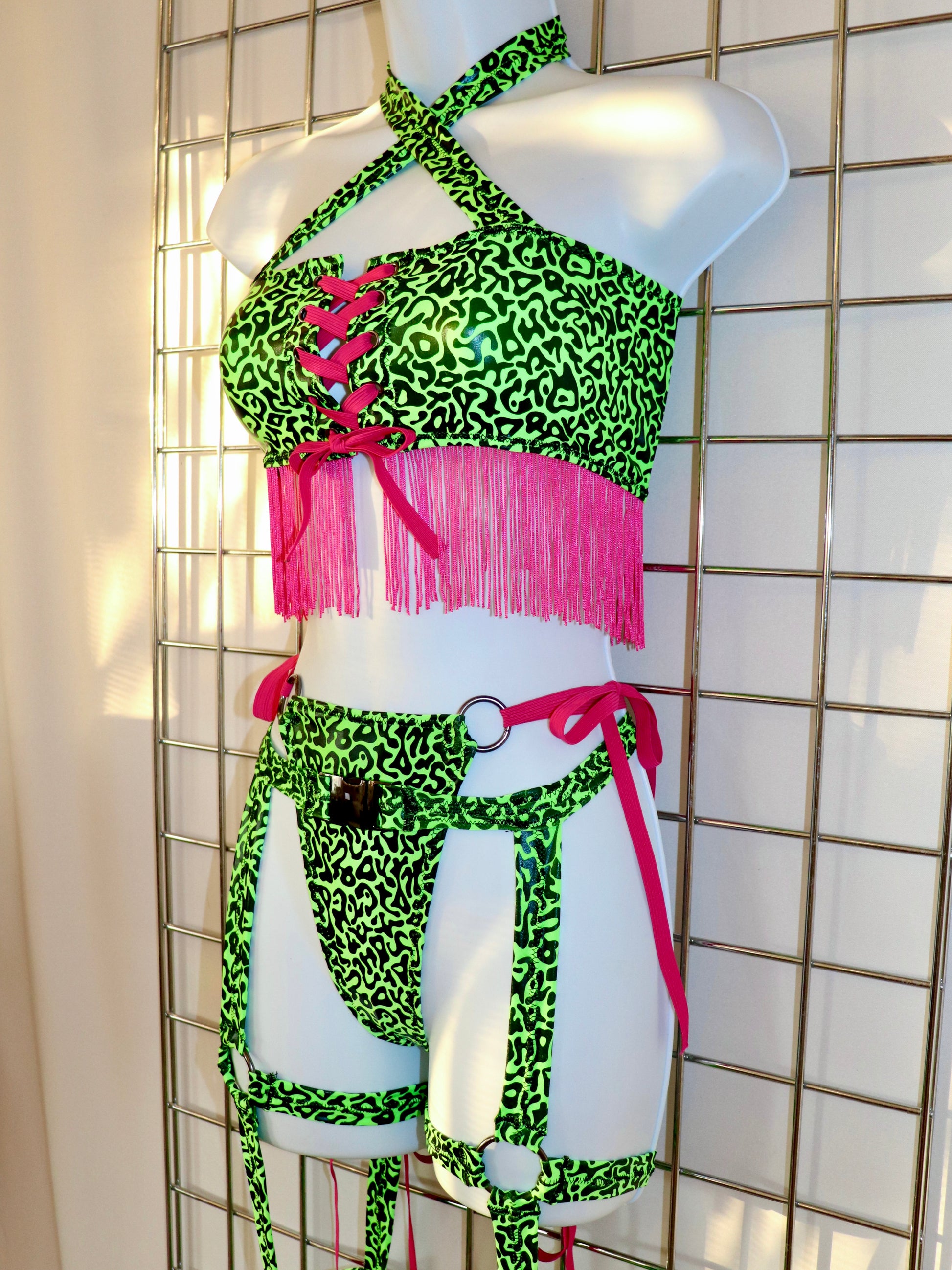 This One-of-a-Kind, 3-piece, Garter Bell Bottom Set includes Top, Bikini Bottoms, and Garter-Bell Bottoms. Made in our playful GoGo Gecko holographic stretch fabric with hot pink accents and gunmetal hardware!